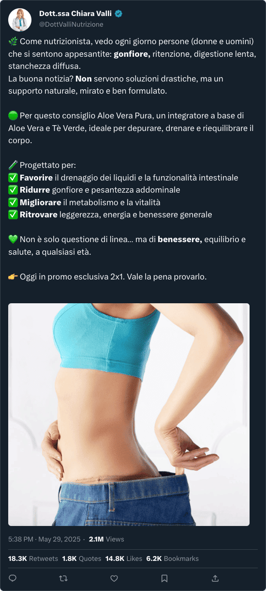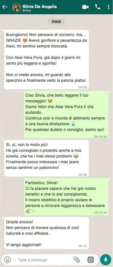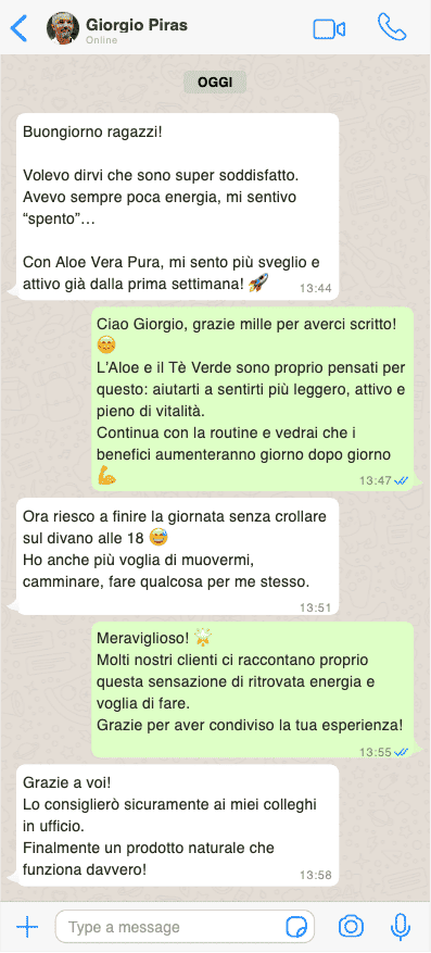 Al contrario, Aloe Vera Pura ha superato ogni aspettativa: le testimonianze reali parlano chiaro. Chi lo ha provato ha notato fin da subito un netto miglioramento di leggerezza, vitalità e benessere, ottenendo un effetto depurativo e drenante naturale, senza effetti collaterali né sostanze sintetiche. Gli ingredienti selezionati di Aloe Vera Pura, come Aloe Vera e Tè Verde, sono scelti per offrire una risposta potente ma priva di rischi.