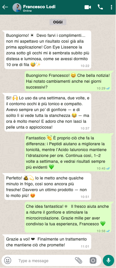 Eye Lissence è un trattamento cosmetico delicato, non invasivo e adatto a tutti i tipi di pelle, anche le più sensibili. Non promette miracoli, ma aiuta concretamente a ritrovare uno sguardo più riposato, levigato e radioso. Come per ogni trattamento naturale, i risultati possono variare da persona a persona: consiglio di applicare le lunette su pelle pulita e lasciarle agire per il tempo indicato per favorire un assorbimento completo dei principi attivi.