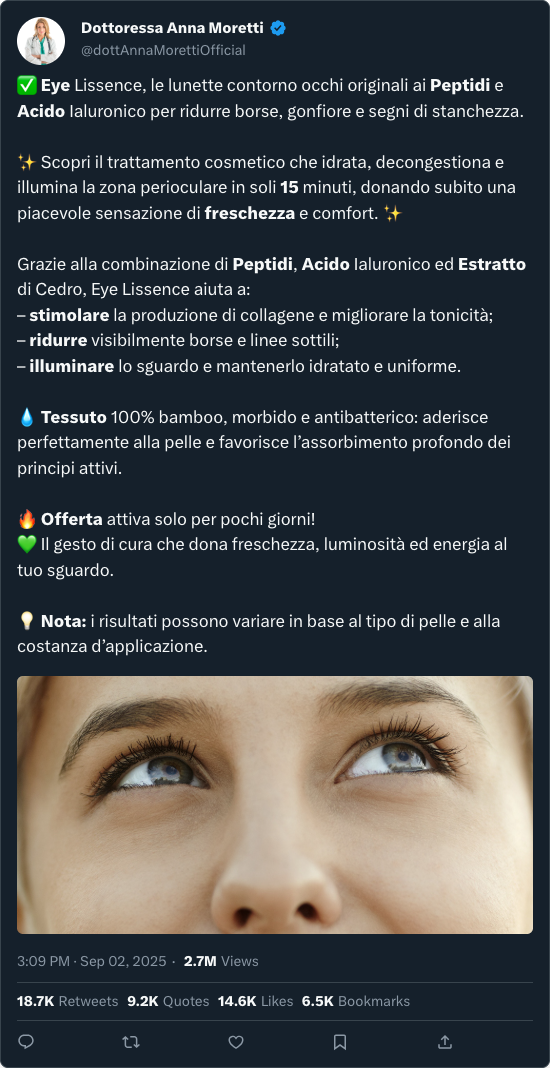 Come cosmetologa, vedo spesso routine sbagliate nel trattare il contorno occhi: creme troppo pesanti, prodotti irritanti o metodi fai-da-te che peggiorano gonfiore e segni di stanchezza. Eye Lissence è diverso: un trattamento bilanciato e innovativo che utilizza attivi noti per la loro efficacia cosmetica.