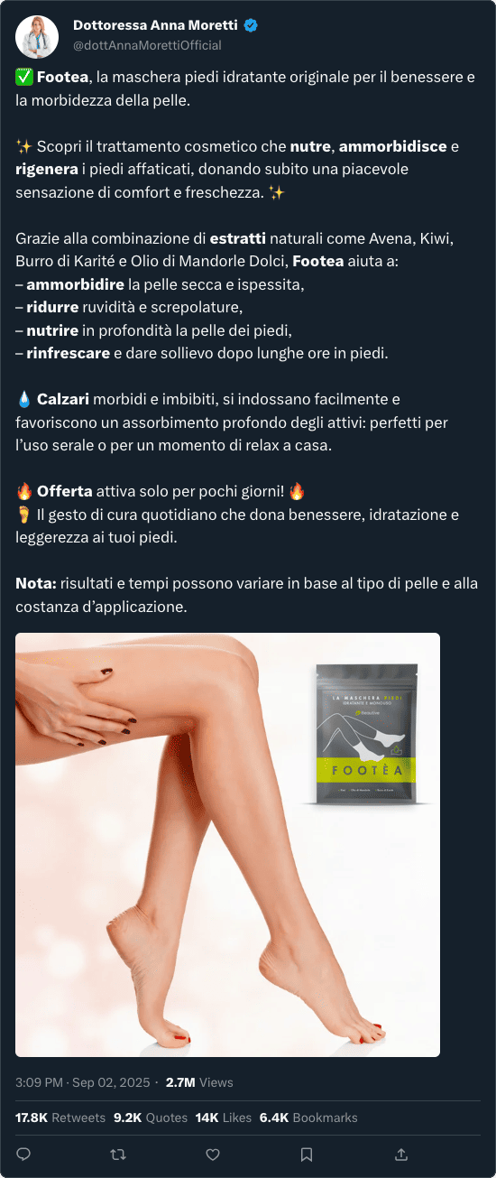 Come cosmetologa, vedo spesso routine errate per la cura dei piedi: prodotti troppo aggressivi, creme poco nutrienti o trattamenti che non riescono a penetrare a fondo la pelle ispessita. Footea è diverso: una formulazione bilanciata che sfrutta estratti naturali noti per la loro efficacia cosmetica — Avena per lenire, Kiwi per rivitalizzare e Burro di Karité e Olio di Mandorle Dolci per nutrire intensamente.