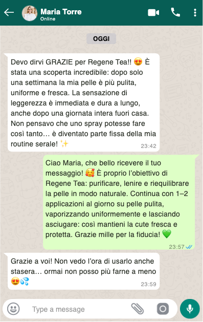 Regene Tea è un trattamento cosmetico delicato e non invasivo: agisce in modo rapido, rinfrescante e adatto a tutti i tipi di pelle, anche le più sensibili. Non promette miracoli, ma aiuta davvero a ritrovare una pelle più pulita, fresca e uniforme, specialmente nelle giornate calde o dopo l’attività sportiva. Come per ogni prodotto naturale, i risultati possono variare da persona a persona: consiglio di vaporizzarlo su pelle pulita, lasciando asciugare senza risciacquare.