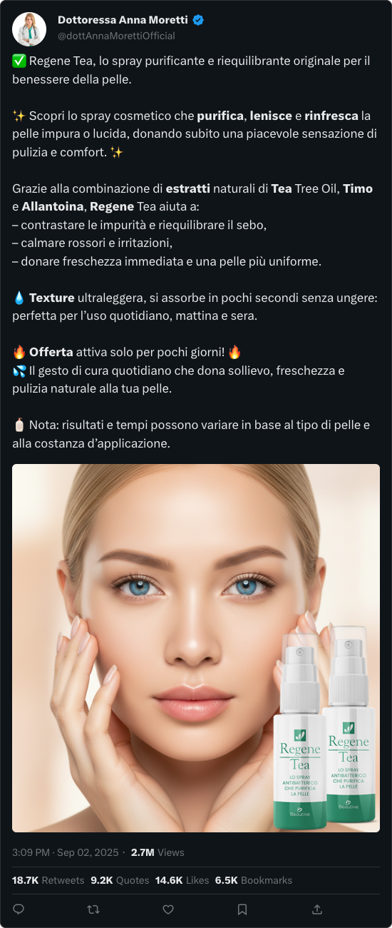 Come cosmetologa, vedo spesso routine errate per la cura della pelle impura: detergenti troppo aggressivi o prodotti che ostruiscono i pori. Regene Tea è una formulazione bilanciata che sfrutta estratti naturali noti per la loro efficacia cosmetica: Tea Tree Oil e Timo per purificare e riequilibrare, Allantoina per lenire, e Glicerina vegetale per mantenere la giusta idratazione.
