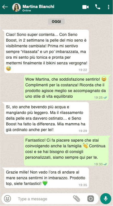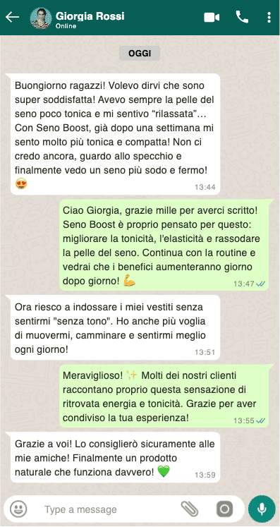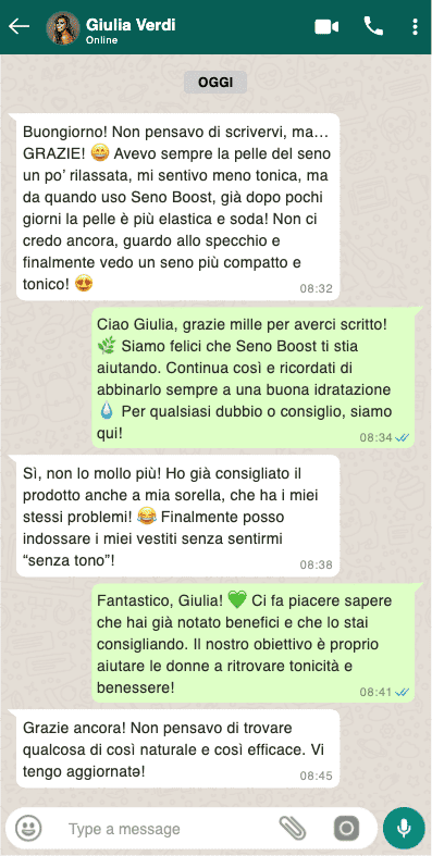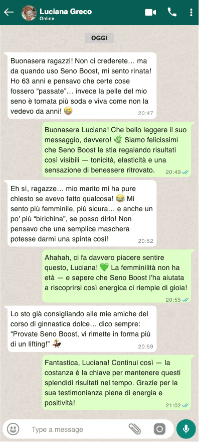 Migliaia di donne, italiane e internazionali, hanno scelto Seno Boost per ritrovare un seno più tonico, compatto e sodo. Adatto a tutte le età, è il trattamento naturale più consigliato per migliorare l'elasticità della pelle, tonificare i tessuti e restituire un aspetto più giovane e fermo al seno.