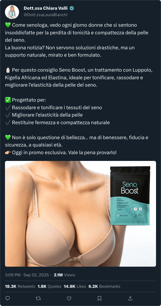 A causa del grande successo di Seno Boost, il mercato si è riempito di imitazioni economiche che promettono risultati miracolosi… ma non garantiscono la stessa efficacia, durata e sicurezza del prodotto originale.