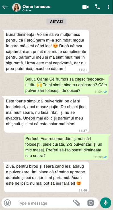 Dacă cauți un spray practic, transparent în formulă și conform cu standardele cosmetice, optează pentru FeroCharm și folosește 2-3 pulverizări pe gât și încheieturi; evaluează persistența pe pielea ta și reaplică atunci când vrei să intensifici efectul.