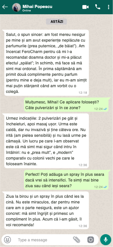 Pentru cei care doresc să își valorifice carisma și prezența, le recomand pacienților mei FeroCharm: un spray de corp cu feromoni, cu o aromă captivantă, creat pentru el și pentru ea. Baza sa hidroalcoolică cu glicerină favorizează o urmă plăcută pe piele; câteva pulverizări pe gât și încheieturi sunt suficiente pentru un rezultat imediat și discret, ideal pentru situațiile sociale în care vrei să te simți mai în largul tău.