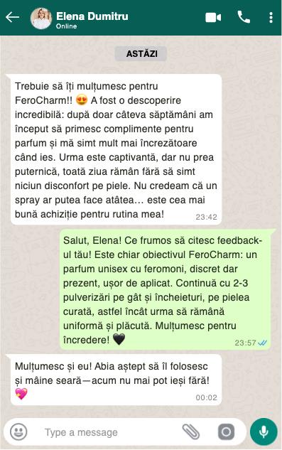 FeroCharm este un gest cosmetic non-invaziv: unisex, rapid și potrivit pentru rutina zilnică, atât ziua, cât și seara. Nu promite „minuni”, dar adaugă un accent magnetic parfumului tău obișnuit și poate contribui la o mai mare siguranță percepută. Ca și în cazul tuturor parfumurilor, efectele sunt subiective: îți recomand să îl încerci pe pielea curată și să evaluezi persistența în funcție de tipul tău de piele.