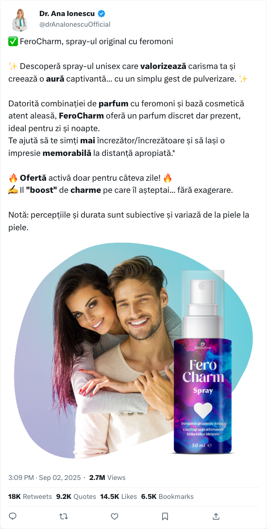 Ca și cosmetolog, observ adesea rutine „de scenă” care pun accent pe urma olfactivă: FeroCharm este un spray de corp cu feromoni (unisex) creat pentru a-ți face prezența mai captivantă și recognoscibilă. Nu este o baghetă magică: este un cosmetic care combină un parfum studiat cu molecule odorante selectate, pentru un efect perceput ca fiind mai seducător și personal.