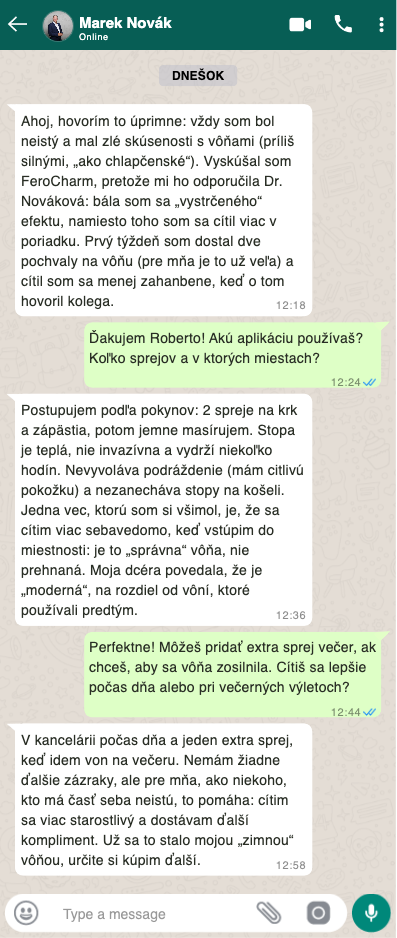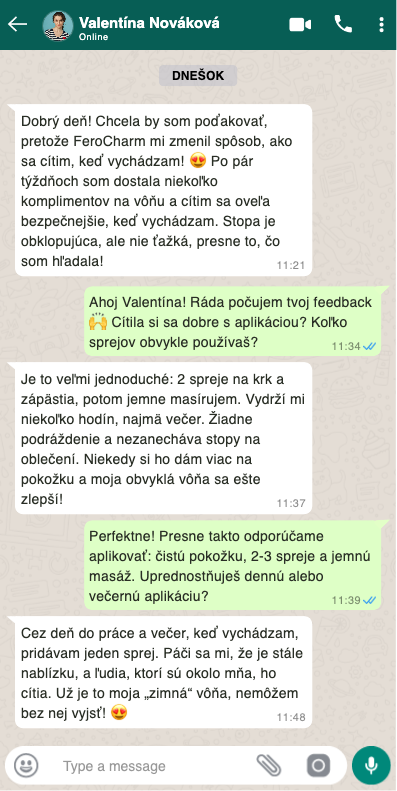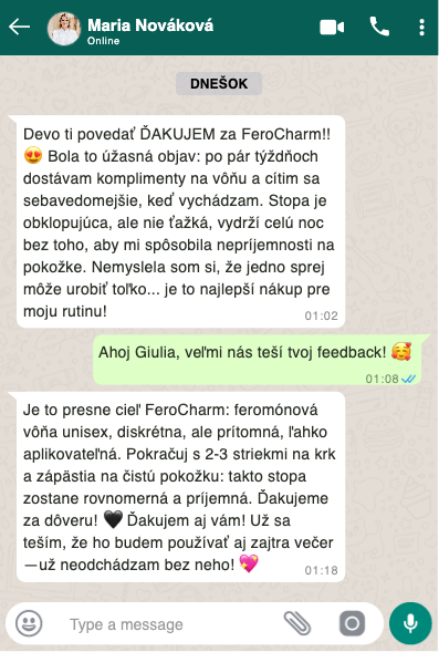 Ak hľadáte praktický sprej, transparentný vo formule a spĺňajúci kozmetické štandardy, zvoľte FeroCharm a používajte 2-3 strieky na krk a zápästia; vyhodnoťte trvácnosť na vašej pokožke a aplikujte, keď chcete zosilniť účinok.